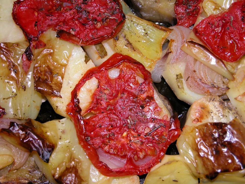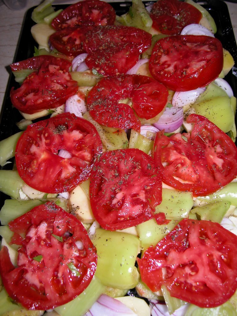 Patlıcanları tuzlu suda bekletirken; patatesleri 1 parmak kalınlığında halka halka, soğanları ay şeklinde, biberleri de 1 parmak kalınlığında doğruyoruz. Domatesin 2 tanesini dilimlerken, diğerlerini rendeleyip içine dövülmüş sarmısakları katıyoruz. Patlıcanların suyunu süzüp sıktıktan sonra fırın tepsimize dizmeye başlıyoruz. (Ben bu yemeği ilk yaptığımda en alta patlıcanları değil de patatesleri koymuştum. Halbuki zeytinyağıyla temas etmeyip buharında pişen patlıcanların ne rengi ne de tadı hiç tatmin etmemişti beni. Sonraki denemelerimde patlıcanları en alta koyduğumda, grimsi bir renk alıp yavan kalan patlıcanların yerine, hafiften kızarmış lokum gibi pişmiş patlıcanlar pek hoşuma gitmişti. O zamandan beri patlıcanları en alta koymayı tercih ediyorum. Size de tavsiye ederim.) Üstüne patatesleri, onun üstüne soğanlarla biberleri diziyoruz. İçine sarmısağı, tuzunu ve karabiberini eklediğimiz domates rendesini tepsinin her yerine gelecek şekilde döküyoruz. En üste de domates dilimlerini dizip biraz kekik serpiştiriyoruz. Sıra geldi zeytinyağına. İşte şimdi, zeytinyağını gerçekten elimizi sakınmayarak döküyoruz. Çünkü bu yemeği hiç su eklemeden pişireceğiz. Yemeği pişiren halis zeytinyağı ve domates suyu. (Tabi her fırının “huyu” farklı oluyor, sizin fırınınız sebzeleri çok kurutuyorsa, çok çok az su ekleyebilirsiniz.) Fırında, 180 derecede en azından 1 saat-1 saat 15 dakika, sebzeler iyice yumuşayıncaya kadar pişiriyoruz.